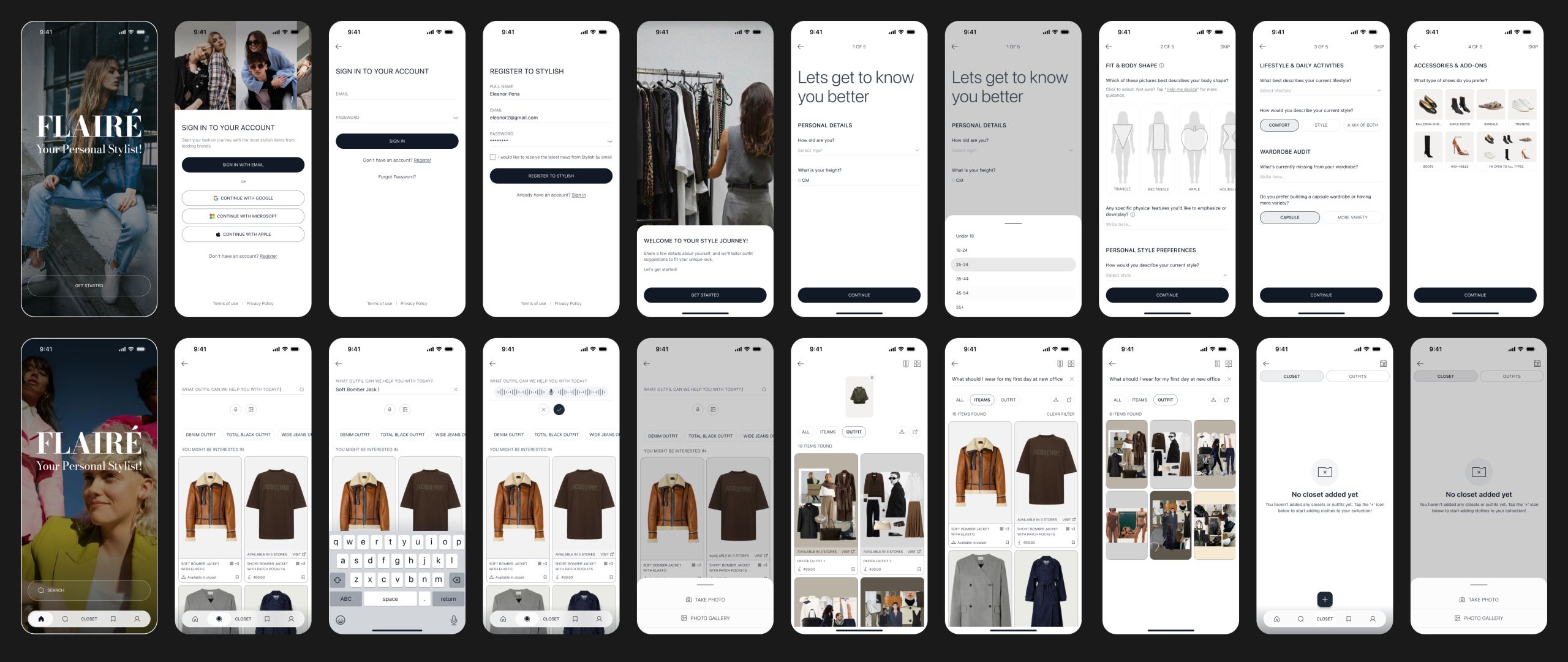 The Flairé application offers a comprehensive mobile solution designed to streamline outfit planning and closet management. Users begin with a personalized onboarding experience to tailor the app to their lifestyle.